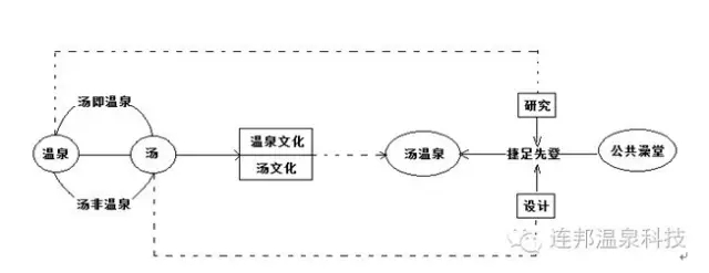 湯溫泉作為第三元,與真溫泉、假溫泉組成關(guān)系,其借助的是市場力量。湯溫泉的出現(xiàn),一開始就沒有向權(quán)威靠攏,也沒有借助行政力量,而是直接問鼎于市場需求,其創(chuàng)造了新的溫泉需求。湯溫泉作為一個概念,從邏輯上講可認為是從湯文化里慢慢演化出來的,但事實上并非如此,其是基于對假溫泉批判的反思,對假的批判被擴大化了,那是一種過錯。由反思而再回看溫泉,亡羊補牢,從中分離出來了湯文化,再由溫泉湯文化走到了湯溫泉,放大文化符號,最終集成性設(shè)計并建造出來了湯溫泉實體(Substance)。