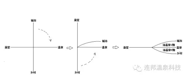 在由城市—鄉(xiāng)村、溫泉—公共澡堂組成的坐標系中,湯溫泉將城市半軸拉到了溫泉附近,笛卡爾坐標系發(fā)生了變形,公共澡堂被拉到了鄉(xiāng)村半軸的延長線上,而隨著湯溫泉在城市中及其周邊的運營成功,以及隨著鄉(xiāng)村養(yǎng)生與度假的發(fā)展趨勢,可以預測到湯溫泉的模式也會來到鄉(xiāng)下,就在真溫泉附近,也會出現(xiàn)在沒有溫泉的鄉(xiāng)村,服務那些并非只是觀光的旅游者,此時鄉(xiāng)村那半軸也會被拉過來,由于連帶關(guān)系,公共澡堂會被再度拉回到與溫泉相對的位置上(圖4)。如此,一個直角的笛卡爾坐標系完成了一個扭曲變化,變成了有些像個一維的數(shù)軸,其實是一條直線與一條曲線組成的另類坐標系,Y軸長短未變,但垂直高度變矮了,Y軸的兩端都趨向于X的正半軸了。