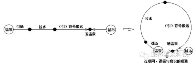 但引湯的距離是有限制的,引湯會讓溫泉水的溫度下降,做好保溫的情況下,可保持在降1℃/km的水平上,而且遠距離引湯也帶了成本提高。當超過幾十公里時,必然會終止管道的物質(zhì)引湯工程,取而代之的是罐車拉水。但拉水不能滿足溫泉酒店對溫泉水的全部需求,因而拉水的引湯可謂是一半是物質(zhì),一半為符號,引湯蛻變?yōu)榱艘栃再|(zhì)。由于還有一車的溫泉水真得被運來,故可稱為溫泉的符號搬運。在超遠距離的情況下,假如溫泉能夠來到城市中,那只能是是引溫泉符號了——符號傳輸,符號是沒有重量的。